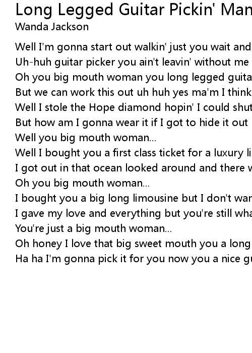 Oh honey I love that big sweet mouth you a long legged guitar pickin' man |