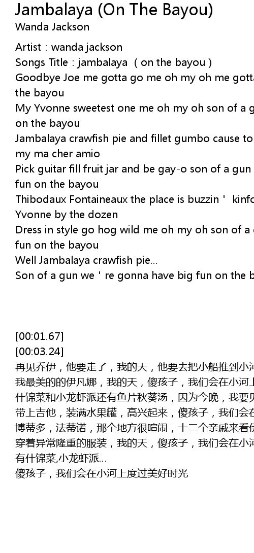 | [00:03.24] | Songs Title:jambalaya (on the bayou) |