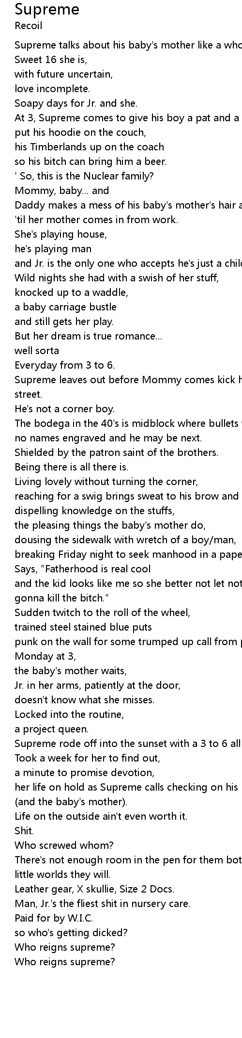 Supreme leaves out before Mommy comes kick his lazy narrow behind back onto the street. |