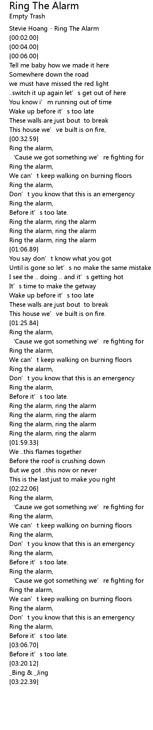 | [00:00.00] | Stevie Hoang Ring The Alarm |