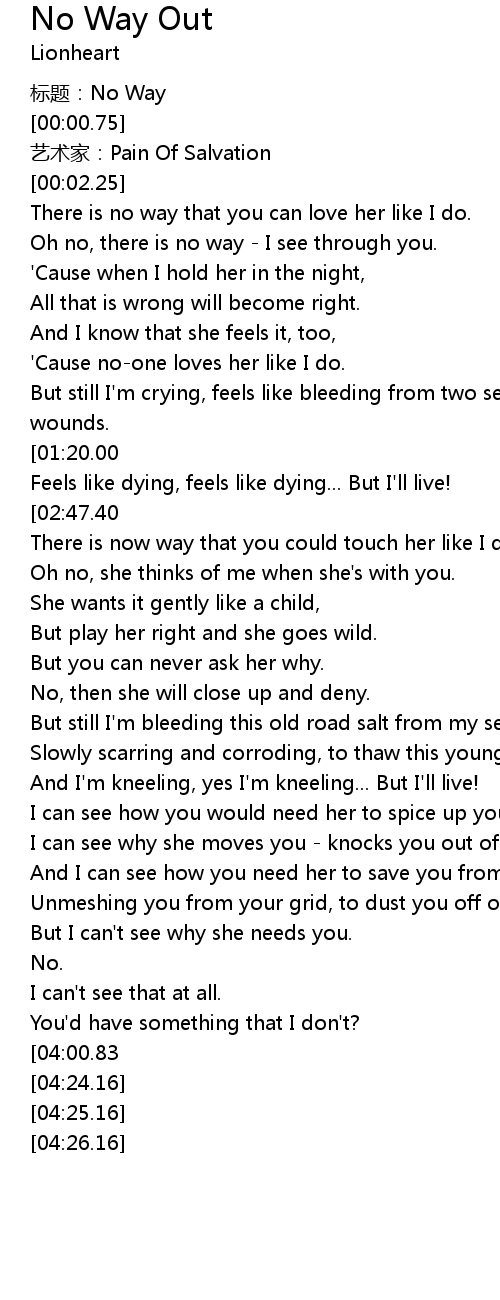 | [00:59.32] | Feels like dying, feels like dying... But I' ll live! |