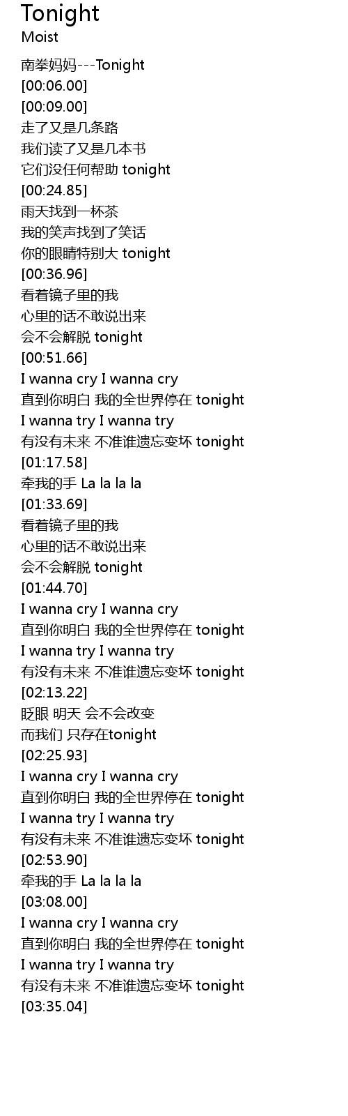| [03:24.09] | yǒu méi yǒu wèi lái bù zhǔn shuí yí wàng biàn huài tonight |