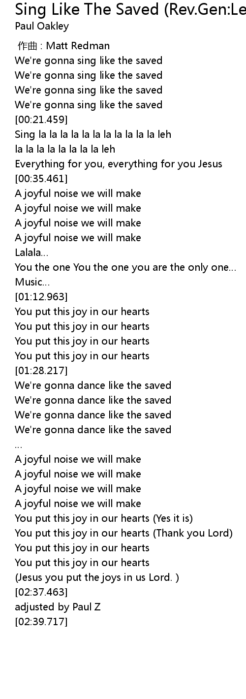| [00:16.966] | We' re gonna sing like the saved |