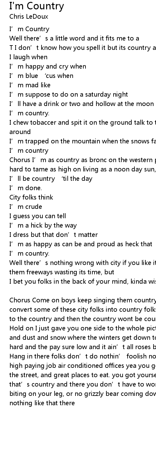 | Chorus I' m as country as bronc on the western plains just as wild and twice as hard to tame as high on living as a noon day sun, yea | |
