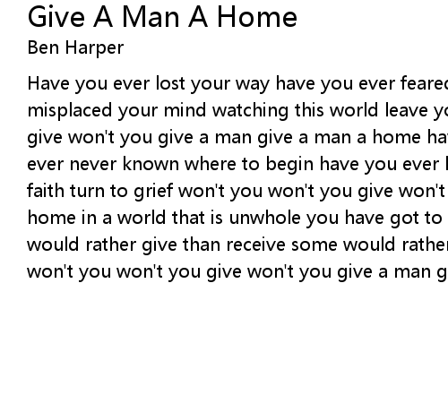 Have you ever lost your way have you ever feared another day have you ever misplaced your mind watching this world leave you behind won't you won't you give won't you give a man give a man a home have you ever worn thin have you ever never known where to begin have you ever lost your belief watching your faith turn to grief won't you won't you give won't you give a man give a man a home in a world that is unwhole you have got to fight to keep your soul some would rather give than receive some would rather give up before they believe won't you won't you give won't you give a man give a man a home