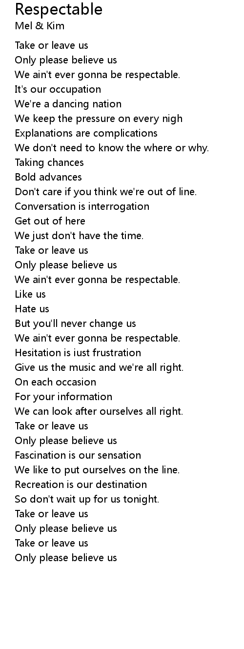 | We ain't ever gonna be respectable. | |