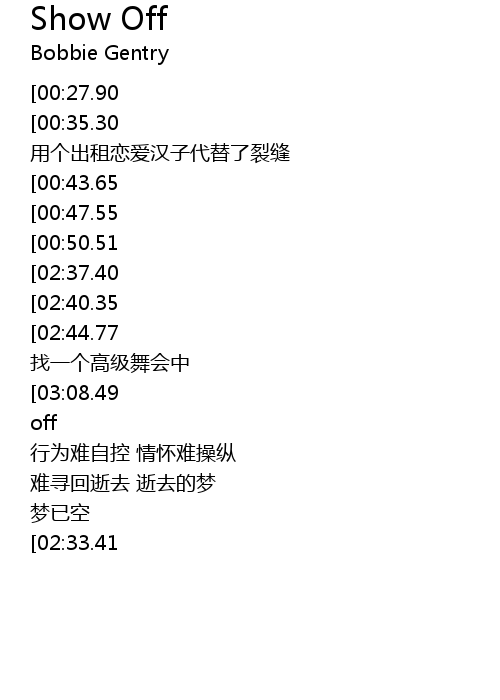 | [03:28.06][03:08.49][02:48.88][01:50.11][01:07.02] | Show off Show off Showing off |