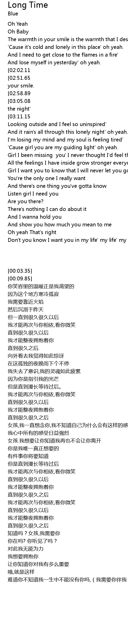 | [03:26.44][02:58.89][02:02.25][00:53.38] | It's gonna be a long long long time' |