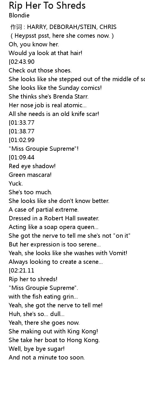 | [02:17.18][01:38.77][00:52.08] | She's so dull, come on rip her to shreds. |