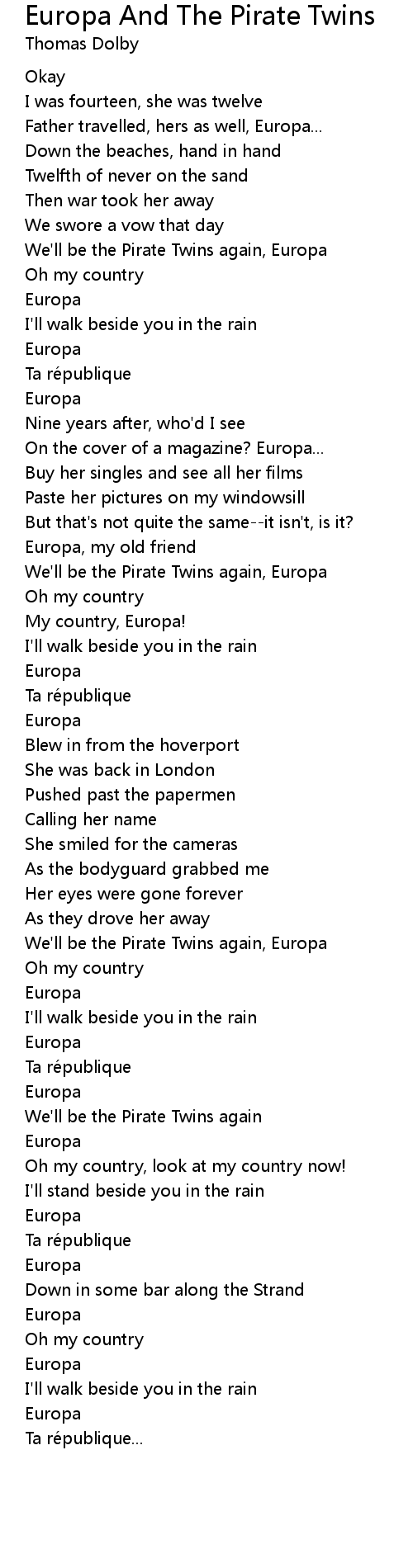 | We'll be the Pirate Twins again, Europa | |