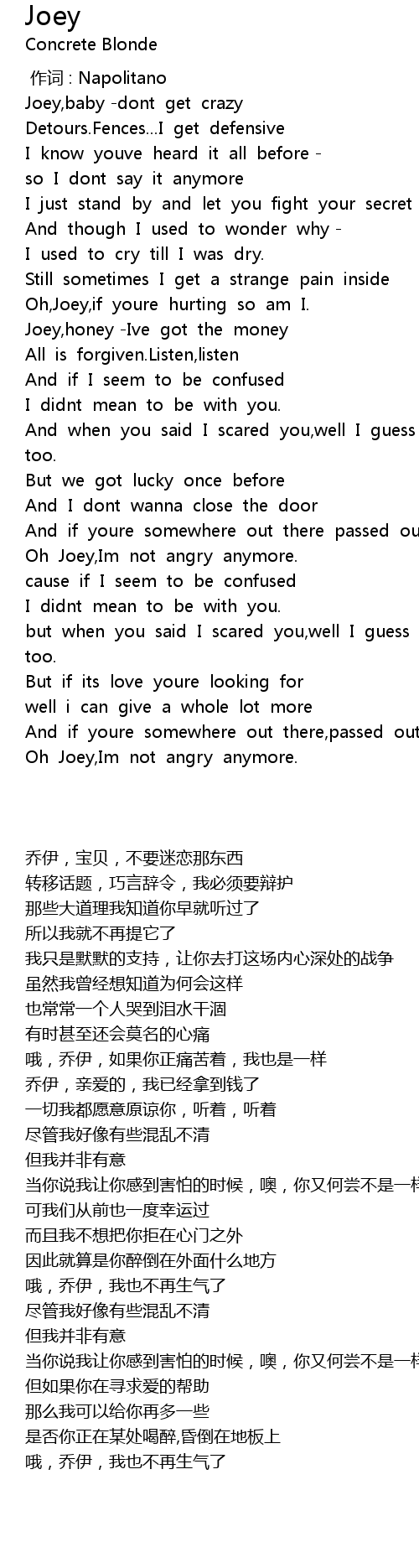 | [01:10.818] | Oh, Joey, if youre hurting so am I. |