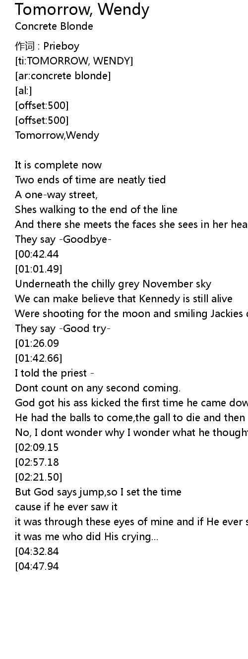 | [00:53.62][00:42.44] | Tomorrow Wendys going to die |