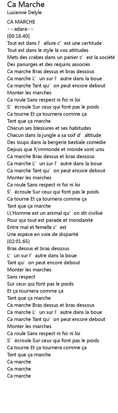 | [02:41.57] | Ca marche Tant qu' on peut encore debout |