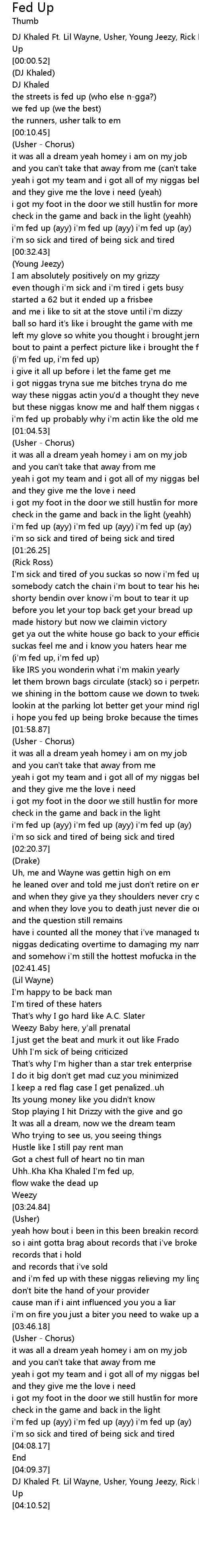 | [04:10.02] | DJ Khaled Ft. Lil Wayne, Usher, Young Jeezy, Rick Ross Drake Fed Up |