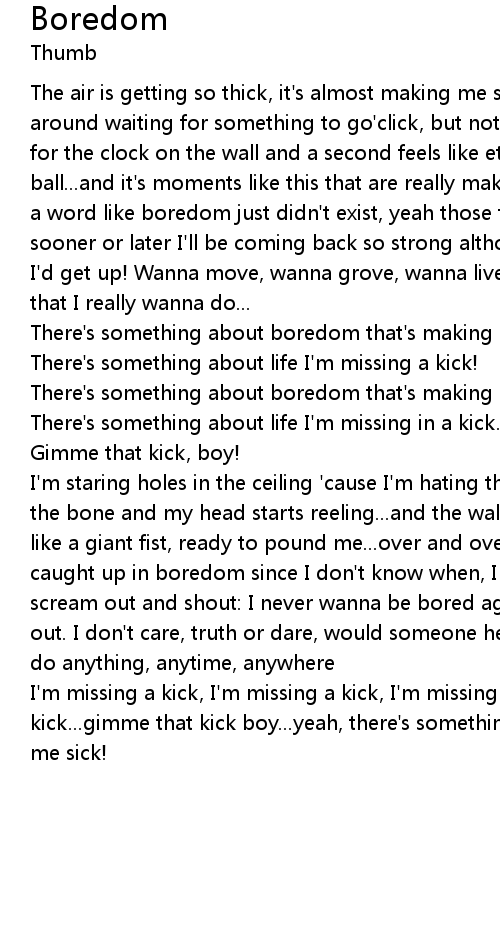 | I'm missing a kick, I'm missing a kick, I'm missing a goddamn a goddamn kick...gimme that kick boy...yeah, there's something about boredom that's making me sick! |