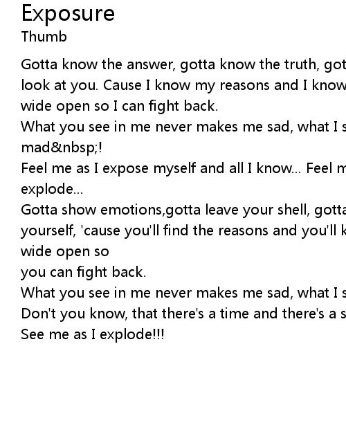| Feel me as I expose myself and all I know... Feel me as I expose myself as I explode... | |