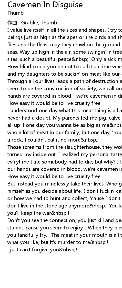 | But instead you mindlessly take their lives. Who gave you the right to play god himself as you decide about life. I don' t fuckin' care ' bout how we used to be or how we had to hunt and collect, ' cause I don' t get the point you see. Hey, we don' t live in the stone age anymore nbsp! You keep the slaughterhouses, so you' ll keep the war nbsp! | |