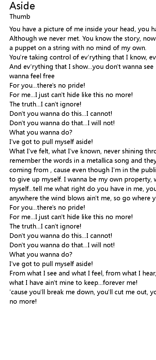 | What I've felt, what I've known, never shining through in what I've shown, now I remember the words in a metallica song and they so perfectly state where I'm coming from , cause even though I'm in the public-eye, doesn't mean that I have to give up myself. I wanna be my own property, with the liberty to decide for myself...tell me what right do you have in me, you try to change my personality, anywhere the wind blows ain't me, so go where you gotto go...without me! | |