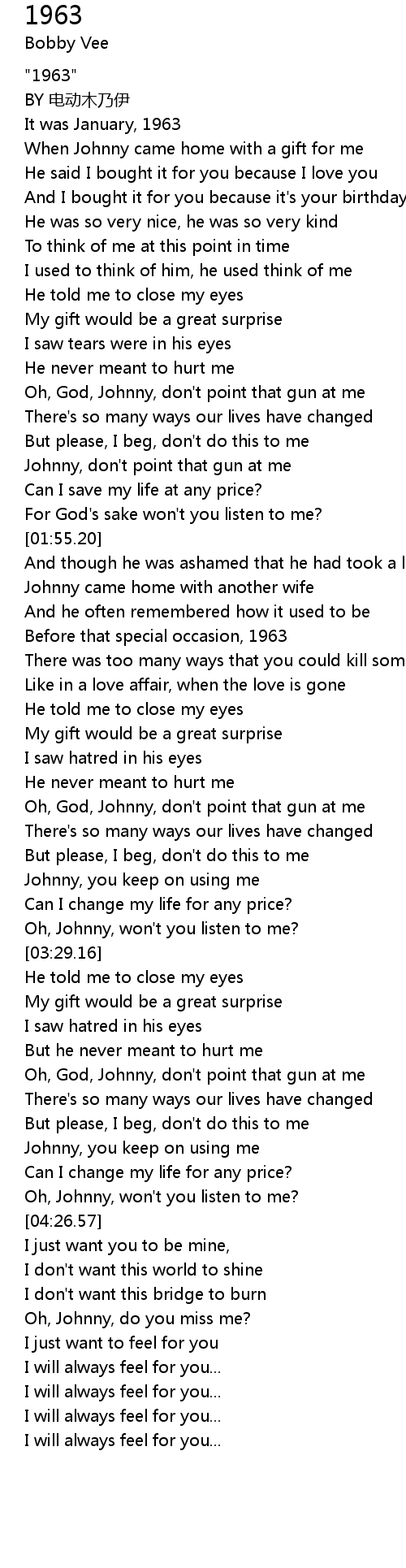 | [04:38.67] | Oh, Johnny, do you miss me? |