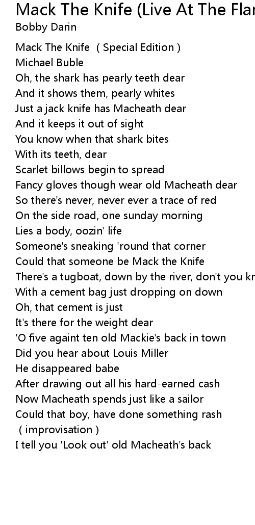 | [00:27.84] | Just a jack knife has Macheath dear |