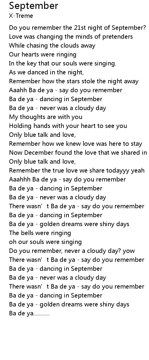 | [02:49.86] | Ba de ya dancing in September |