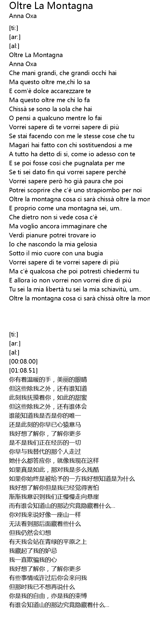 | [02:57.45] | Oltre la montagna cosa ci sarà chissà oltre la montagna, oltre.. |