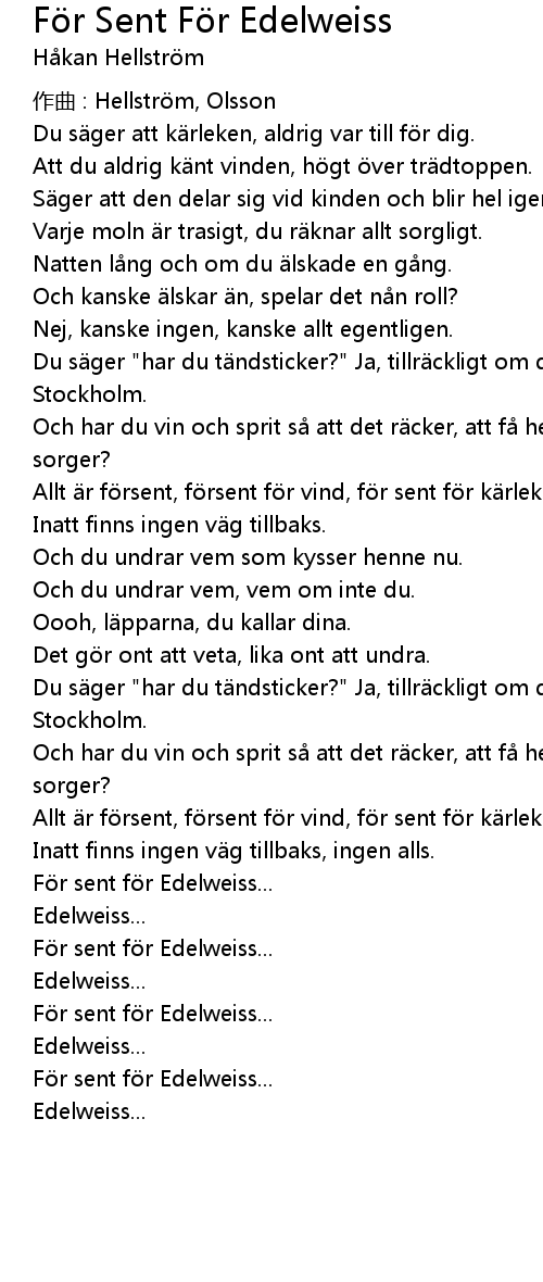 | Allt är försent, försent för vind, för sent för kärlek, ren som snö. | |