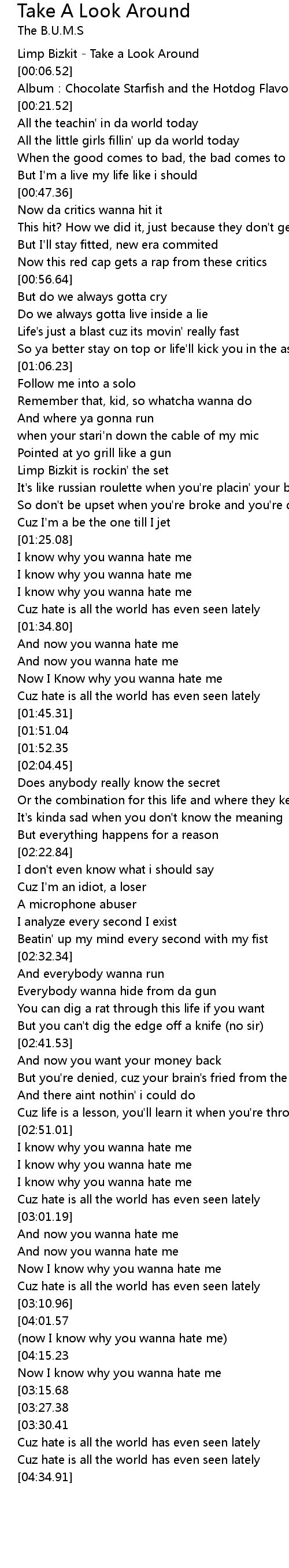 | [00:01.52] | Limp Bizkit Take a Look Around |