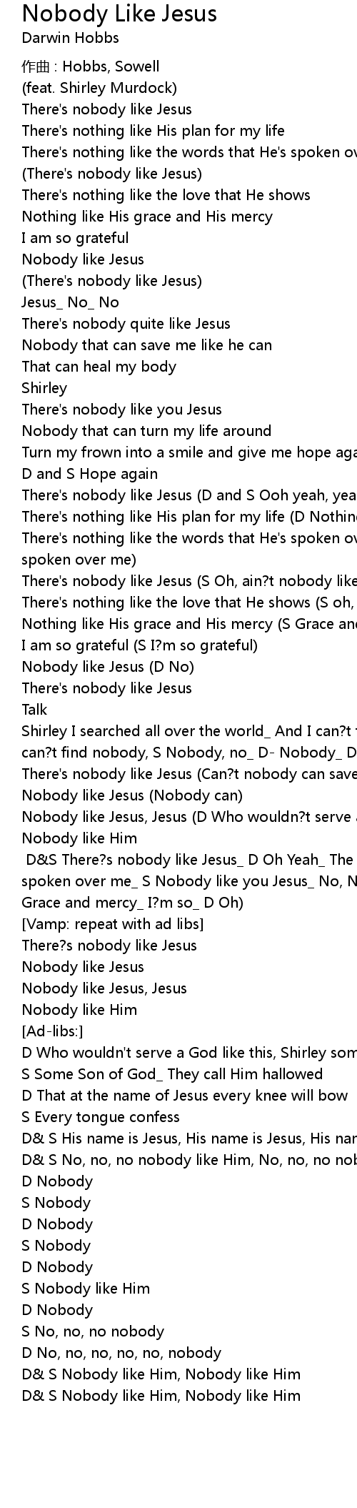 | D S No, no, no nobody like Him, No, no, no nobody like Him | |