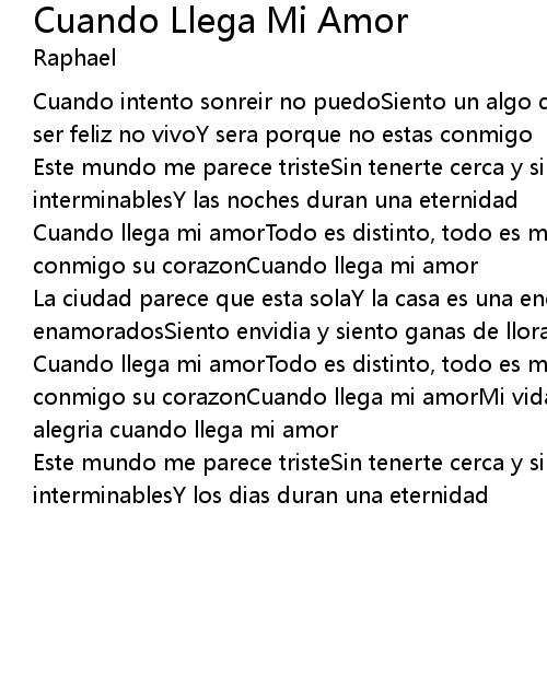 Cuando llega mi amorTodo es distinto, todo es mejorCuando llega mi amorCanta conmigo su corazonCuando llega mi amorMi vida cambia; todo es esperanzaTodo es alegria cuando llega mi amor |