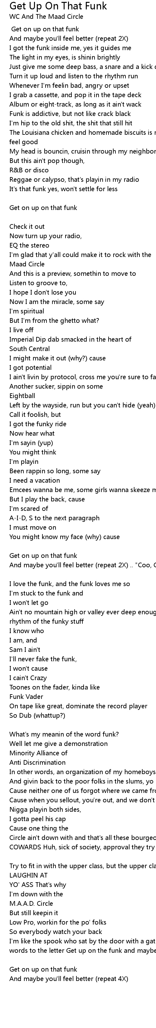 Won't you step to the front and give the real meanin of the word funk [W.C.] |