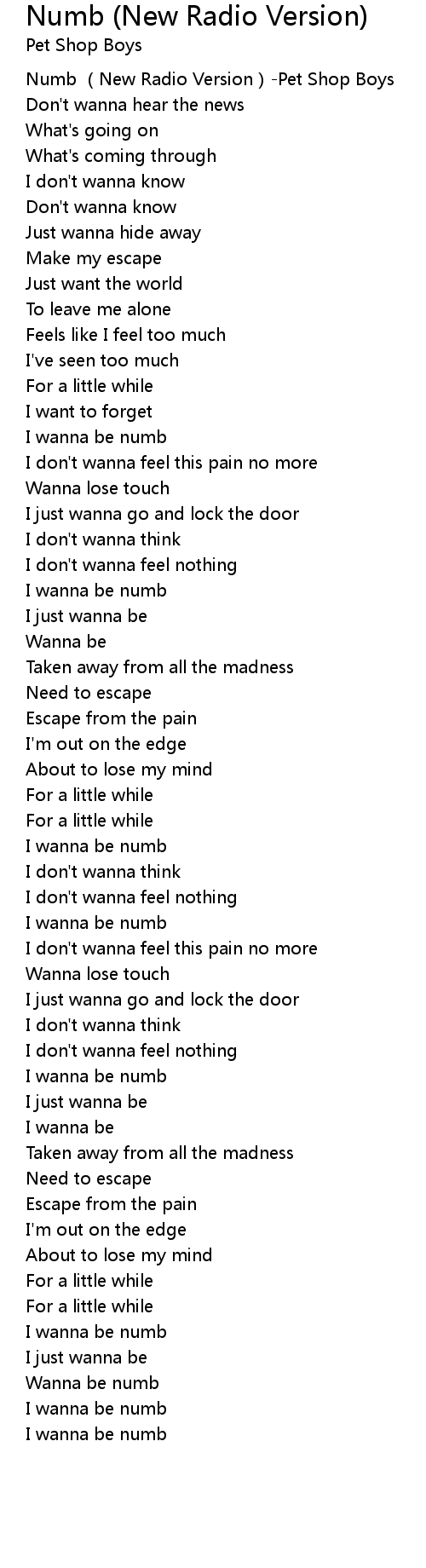 | [00:00.241] | Numb (New Radio Version)-Pet Shop Boys |