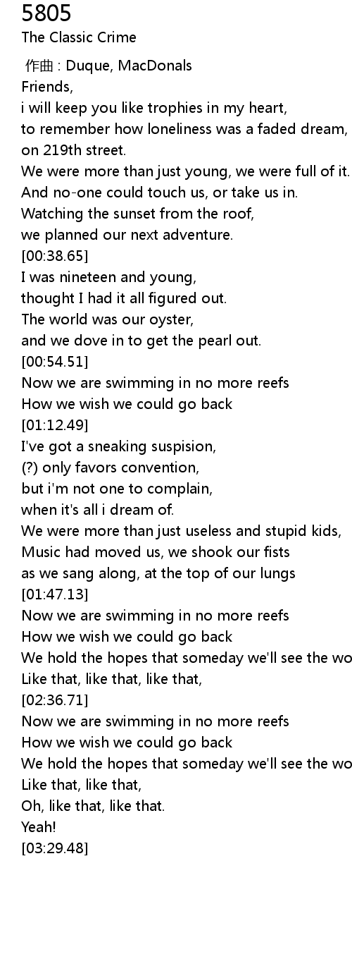 | [02:37.96] | Now we are swimming in no more reefs |