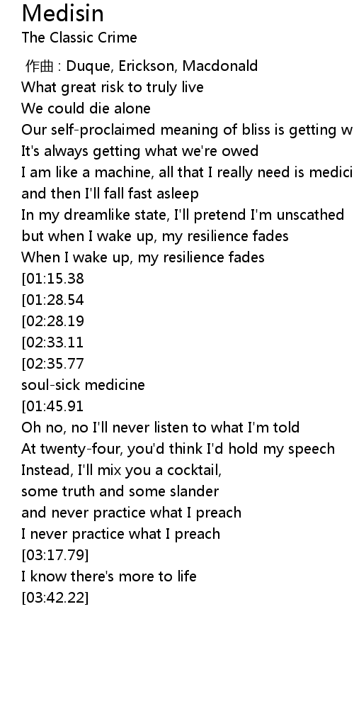 | [00:52.76] | I am like a machine, all that I really need is medicine |