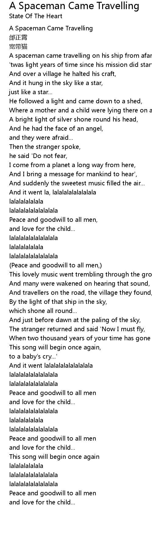 | [00:03.96] | A Spaceman Came Travelling |
