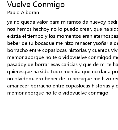 | ya no queda valor para mirarnos de nuevoy pedirnos perdon por todo el da o que nos hemos hechoy no lo puedo creer, que ha sido de aquellos momentoscuando no existia el tiempo y los momentos eran eternospasa el tiempo y yo no olvidoquiero beber de tu bocaque me hizo renacer yso ar a deshoras conmil un amanecer borracho entre copaslocas historias y cuentos vividosque siguen en mi memoriaporque no te olvidovuelve conmigodime si eres capaz de rechazar nuestro pasadoy de borrar esas caricias y que de mi te has cansadodime que ya no me quieresque ha sido todo mentira que no daria por mi la vidapasa el tiempo y yo no olvidoquiero beber de tu bocaque me hizo renacer yso ar a deshoras conmil un amanecer borracho entre copaslocas historias y cuentos vividosque siguen en mi memoriaporque no te olvidovuelve conmigo |