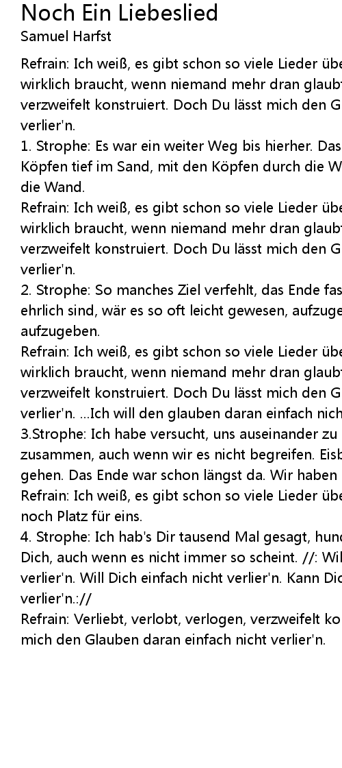 | Refrain: Ich wei, es gibt schon so viele Lieder ü ber Liebe, die kein Mensch wirklich braucht, wenn niemand mehr dran glaubt. Verliebt, verlobt, verlogen, verzweifelt konstruiert. Doch Du l sst mich den Glauben daran einfach nicht verlier' n. | |