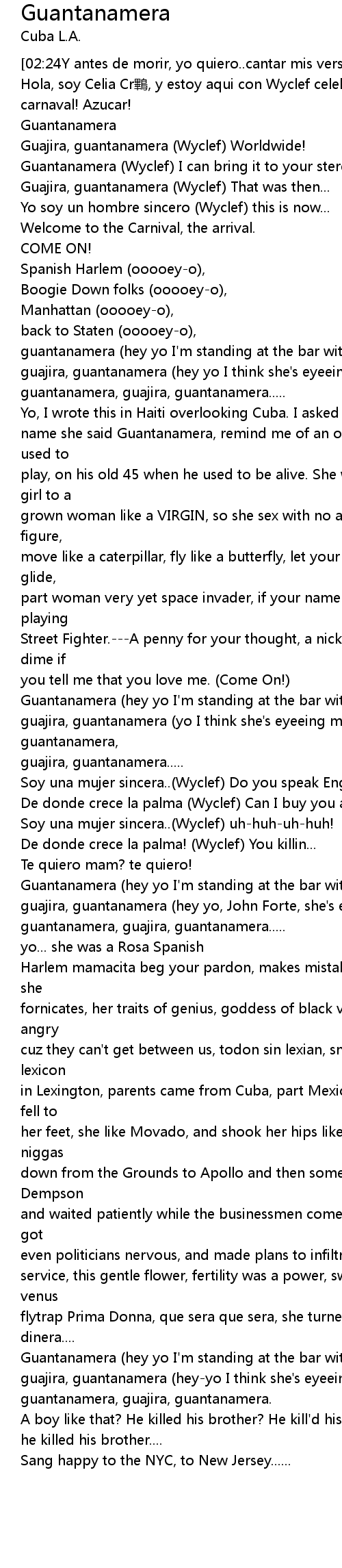 | [00:14.00] | Guantanamera Wyclef I can bring it to your stereo.. |