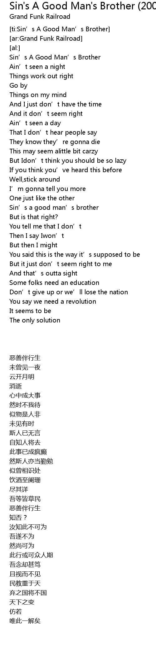 | [00:01.37] | Sin’s A Good Man’s Brother |