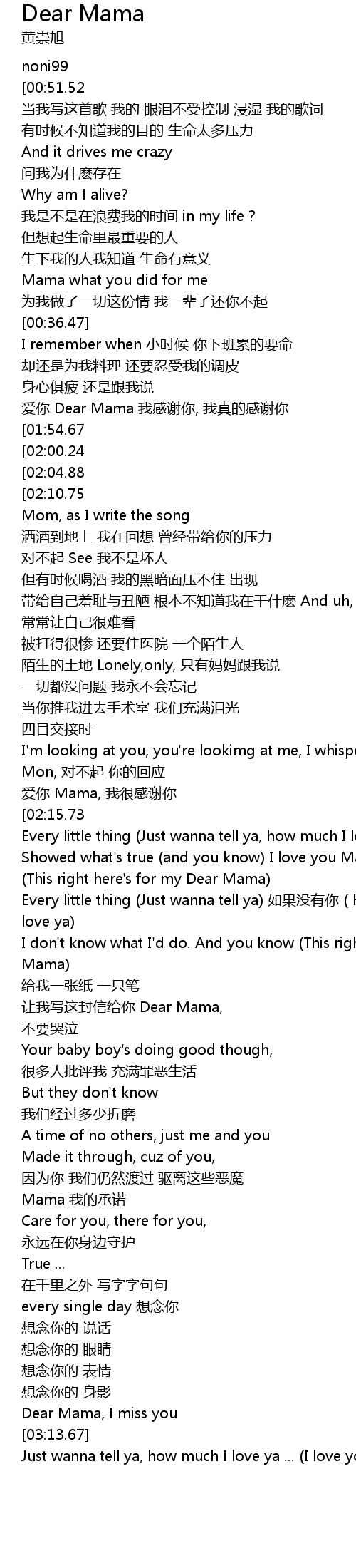 | [00:47.75] | ài nǐ Dear Mama wǒ gǎn xiè nǐ, wǒ zhēn de gǎn xiè nǐ |