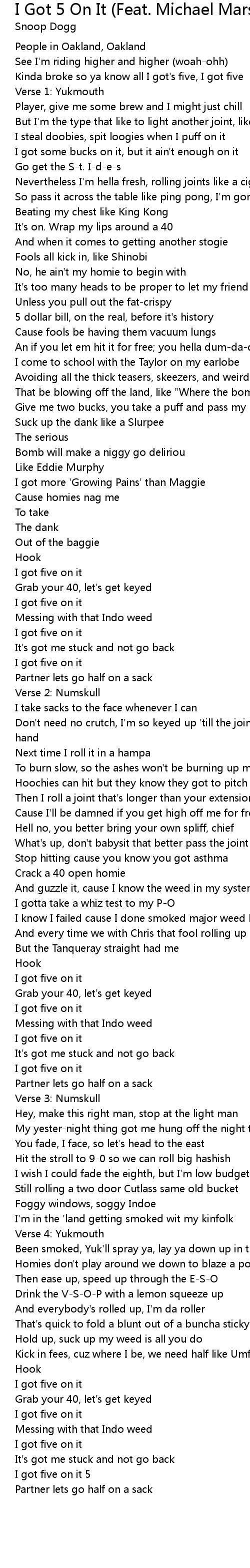But I'm the type that like to light another joint, like Cypress Hill |