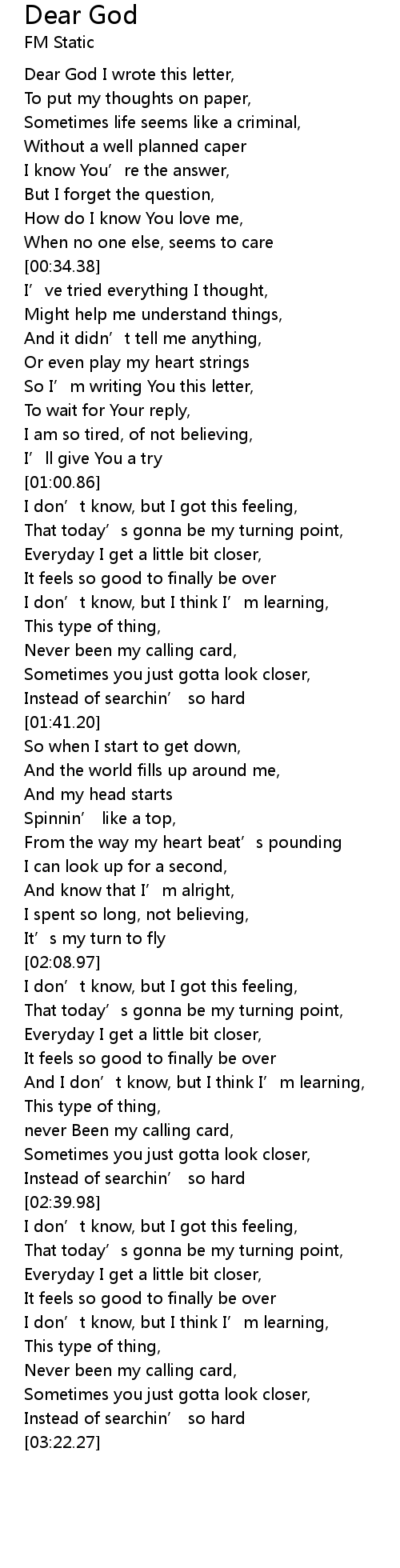 | [00:00.92] | Dear God I wrote this letter, |