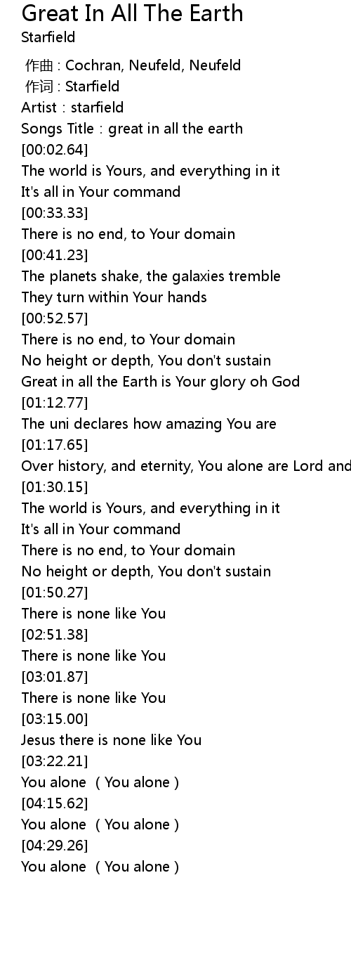 | [01:07.86] | Great in all the Earth is Your glory oh God |