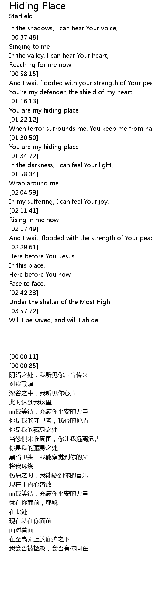 | [01:18.44] | You are my hiding place |