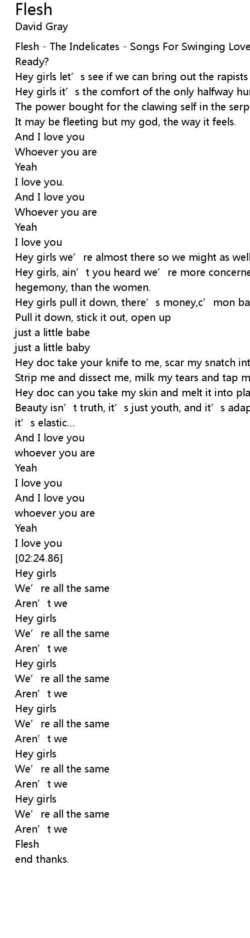 | [00:02.64] | Flesh - The Indelicates - Songs For Swinging Lovers |