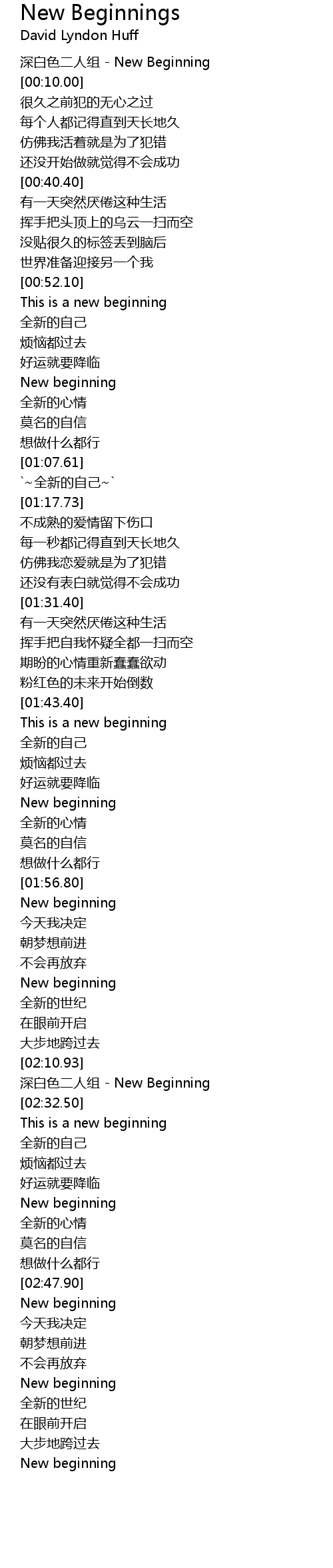 | [00:02.00] | shēn bái sè èr rén zǔ New Beginning |