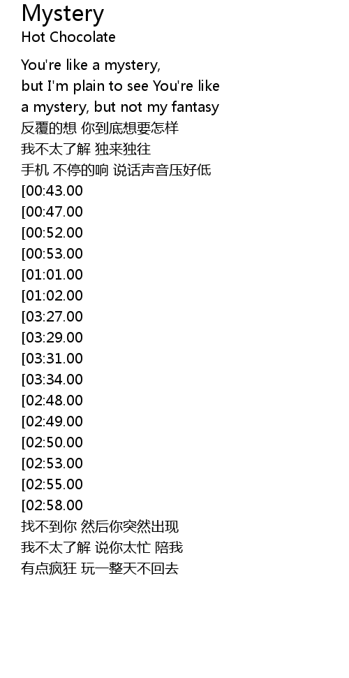 | [03:48.00][02:53.00][01:28.00] | You' re like a mystery , |