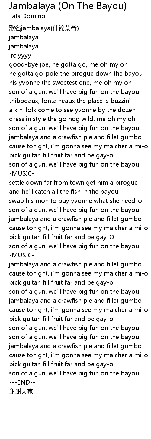 | [00:47.77] | son of a gun, we' ll have big fun on the bayou |