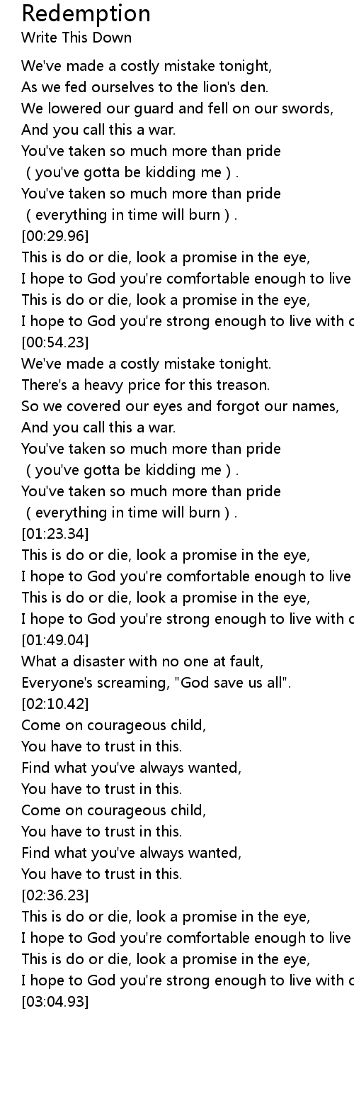| [00:30.99] | This is do or die, look a promise in the eye, |