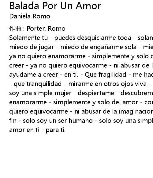 | Solamente tu - puedes desquiciarme toda - solamente tu - romperas mi soledad - miedo de jugar - miedo de engañarme sola - miedo de caer intentando florecer - ya no quiero enamorarme - simplemente y solo del amor - convenceme - ayudame - a creer - ya no quiero equivocarme - ni abusar de la imaginación - convenceme ayudame a creer - en ti. - Que fragilidad - me hace estar dispuesta hasta llorar - que tranquilidad - mirarme en otros ojos viva - solo soy un ser humano - solo soy una simple mujer - despiertame - descubreme - al fin - ya no quiero enamorarme - simplemente y solo del amor - convenceme ayudame - a creer - ya no quiero equivocarme - ni abusar de la imaginacion - despiertame - descubreme - al fin - solo soy un ser humano - solo soy una simple mujer - que busca ser aquel amor en ti - para ti. |